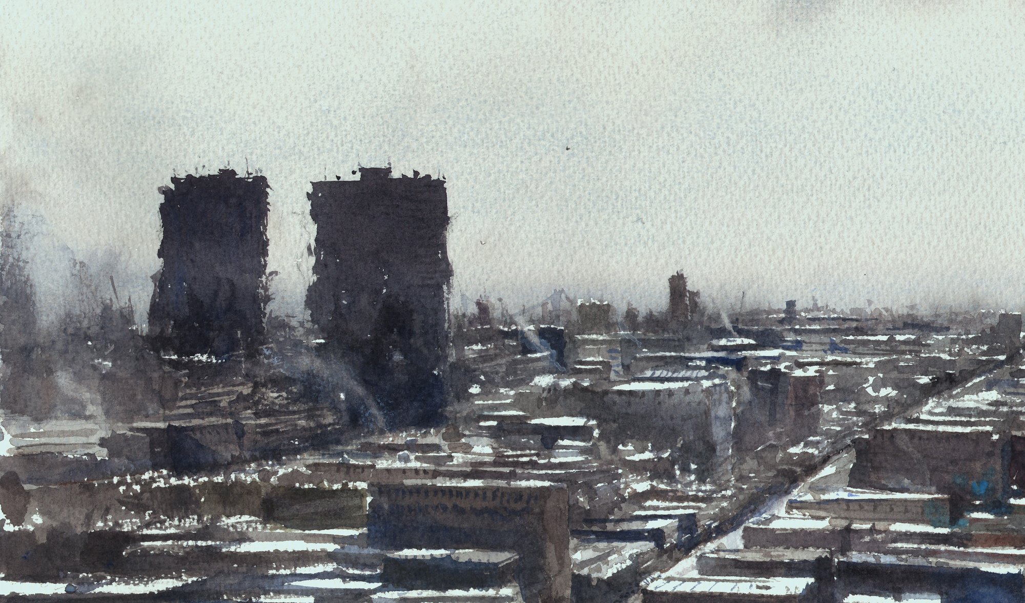 Original watercolor painting of the view of East Harlem after the 2026 blizzard in mid February. I think we ended up getting around 22" of snow. We hadn't been getting too much these past few years, so I welcome the change.