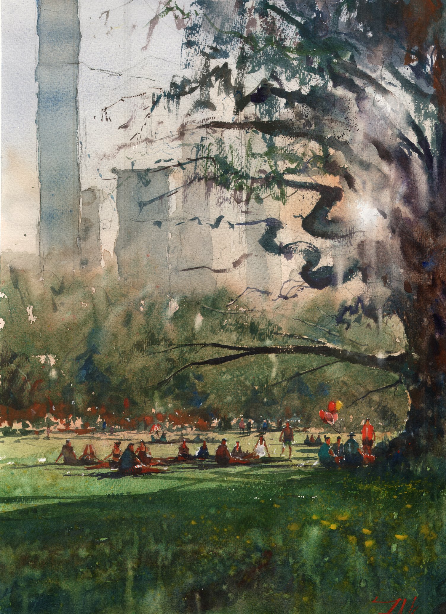 Painting is of some folks gathered on the first warm day of spring in Sheep's Meadow in Central Park.