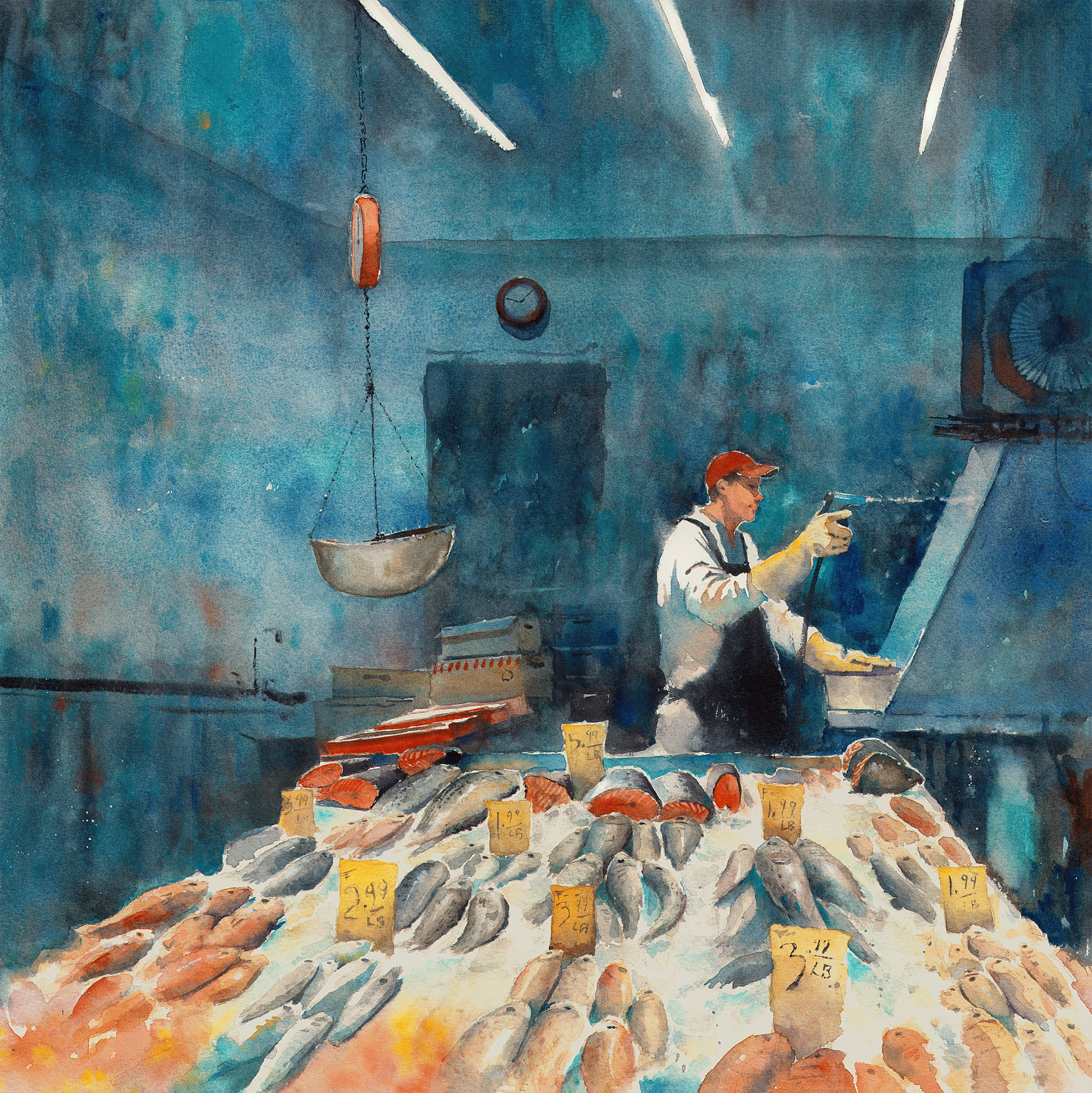 22"x22" original watercolor of a fishmonger in Chinatown, NYC. A white trim is left for matting and framing. Ships in a tube with insurance. Framing is available for local pick up only.